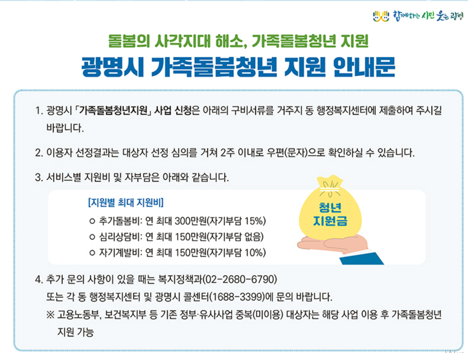 경기도 광명시에서 가족 돌봄 청년지원사업을 실시한다고 합니다. 세 가지 지원이 있는데 지원별 금액이 다릅니다.