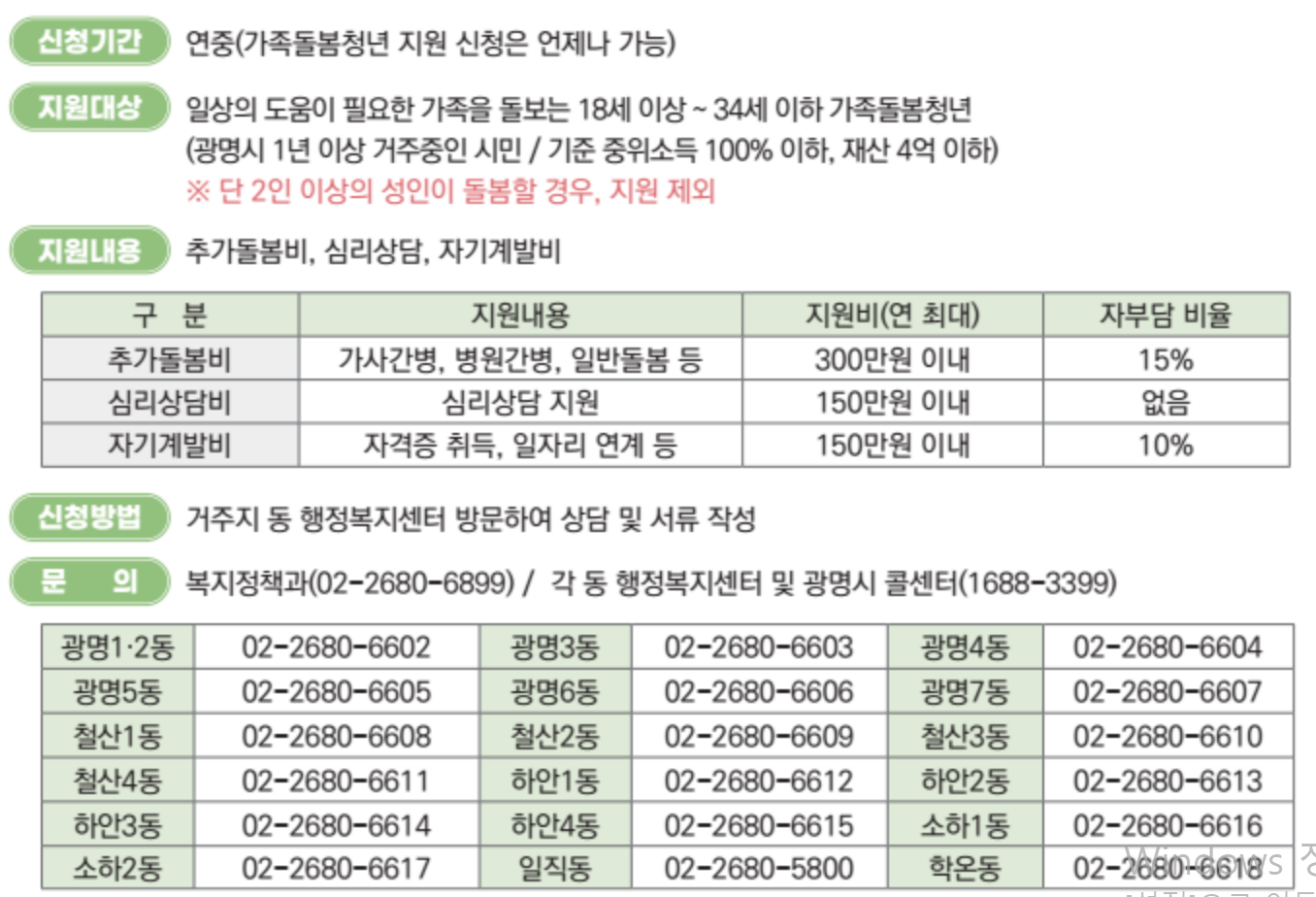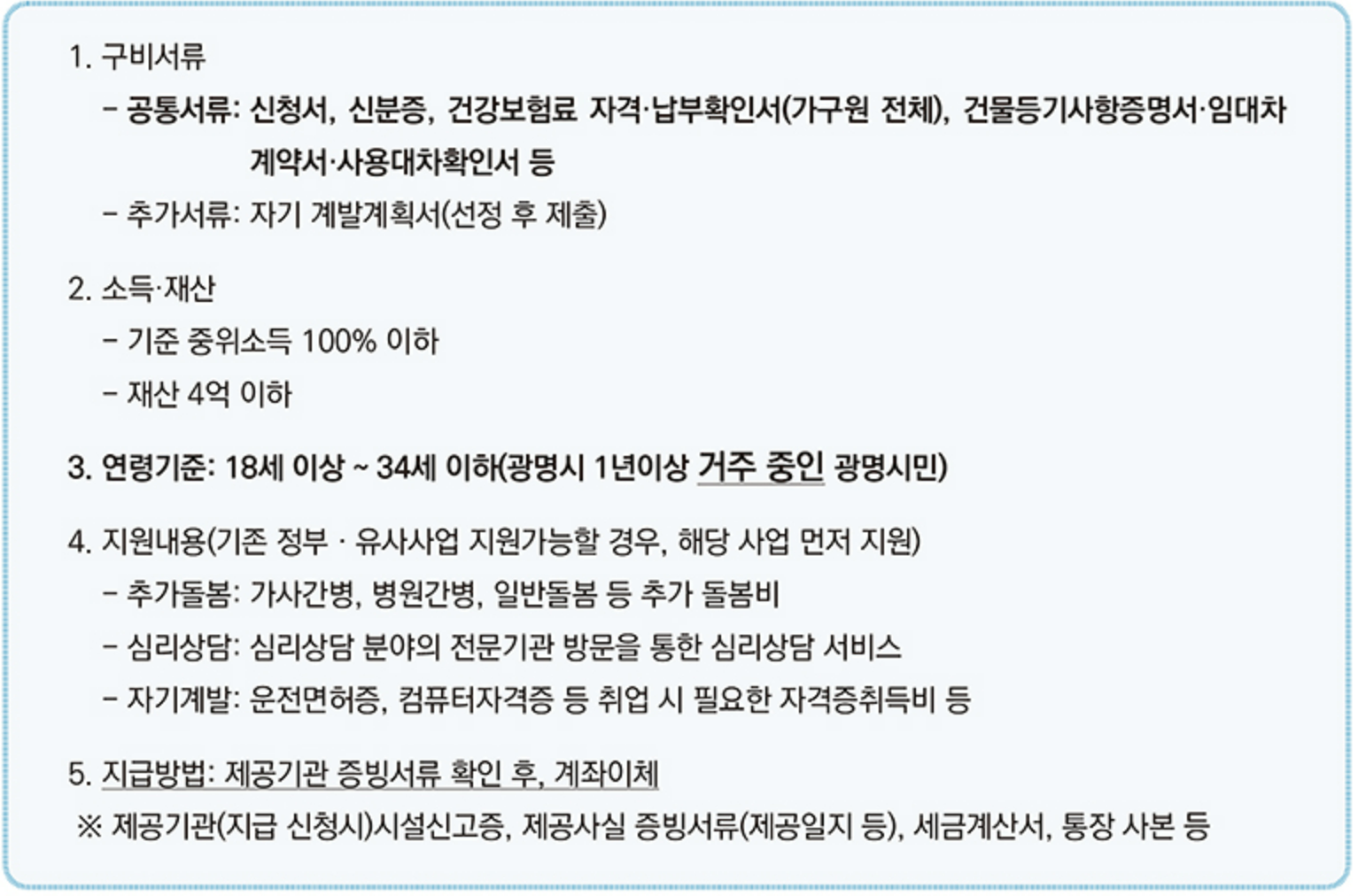 - 도움이 필요한 청년은 동 행정복지센터, 광명시청 복지정책과에서 신청할 수 있으며, 기타 자세한 문의 사항은 복지정책과(02-2680-6899)에서 안내받을 수 있습니다.